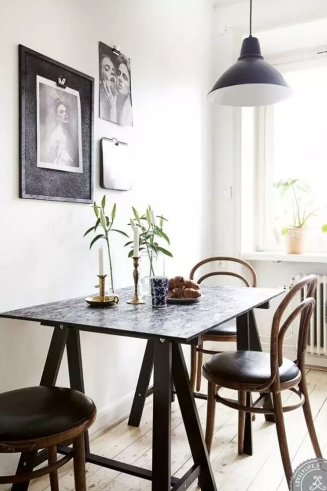 A small round table paired with two black chairs offers a perfect spot for quick meals or morning coffee.