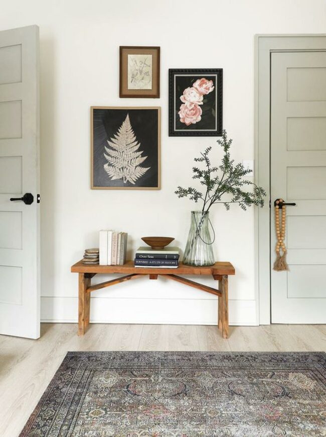 A simple wooden bench anchors the space with curated objects like a small bowl, books, and a clear glass vase holding green branches.