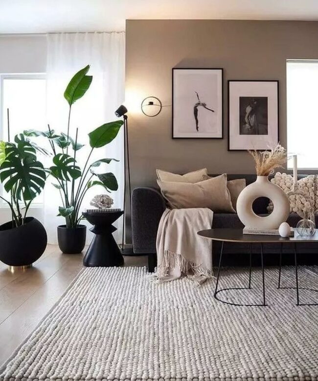 Black and neutral tones work harmoniously to craft a peaceful, inviting atmosphere.