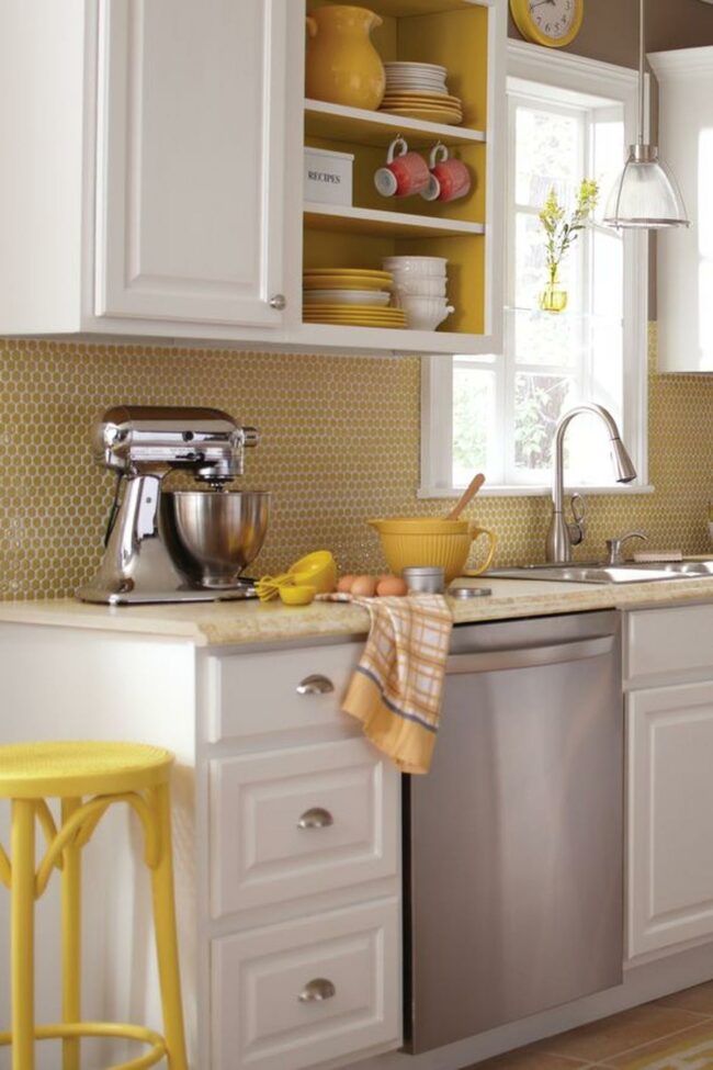 Sunshine pours into this joy-filled kitchen where the yellow honeycomb backsplash creates an eye-catching focal point against crisp white cabinets.