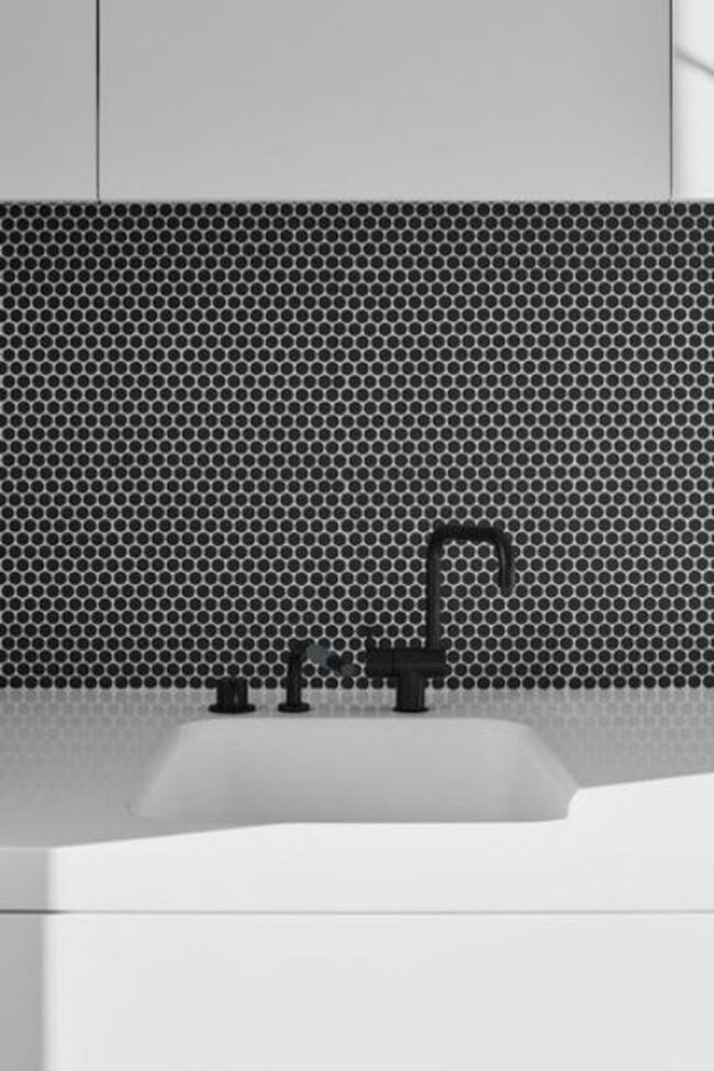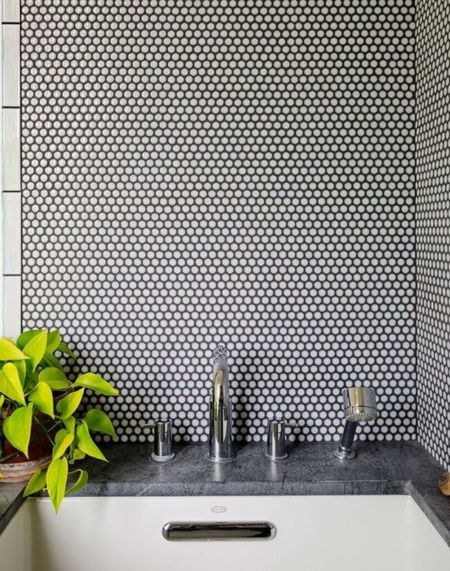 Small round black and white tiles create a striking backdrop for this eye-catching bathroom sink area.