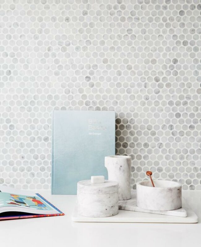 Small round tiles create an eye-catching backsplash texture that breaks up the smooth surfaces throughout the room.