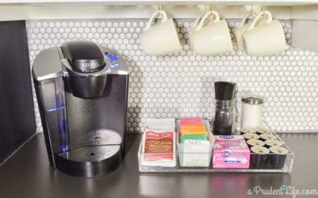 Everything stays organized with a clear tray holding various tea options, sugar packets, and creamers all within easy reach.
