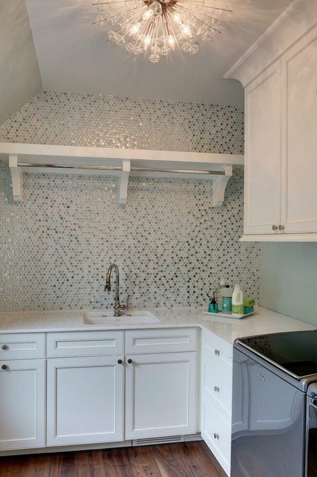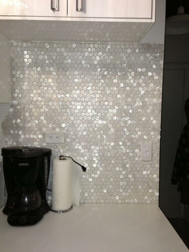 Modern round tiles create a dazzling backsplash that reflects light beautifully in this welcoming kitchen corner.