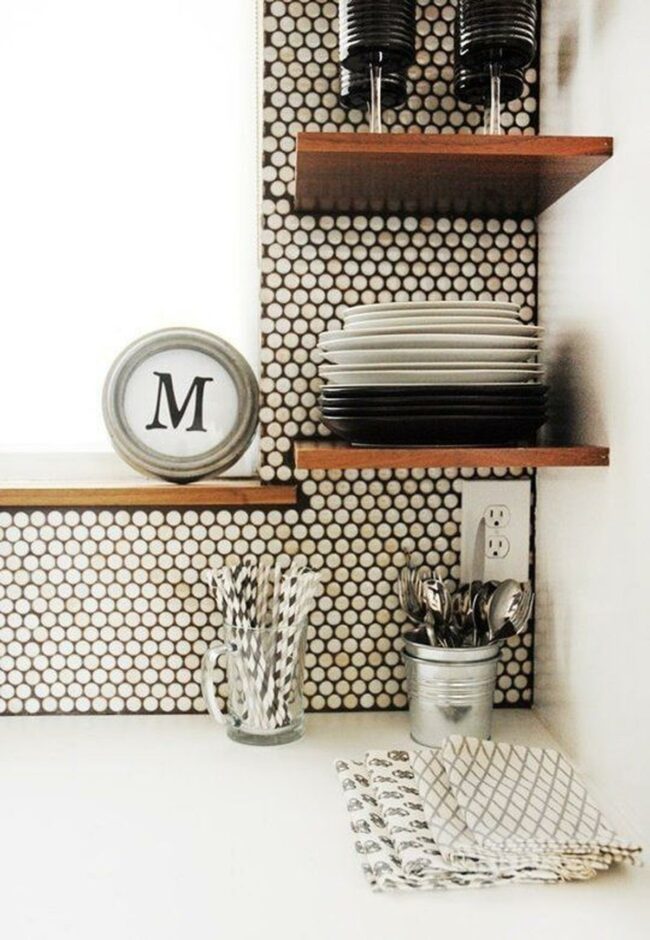 Small black round tiles form a playful backsplash pattern that immediately draws attention while adding character to the space.