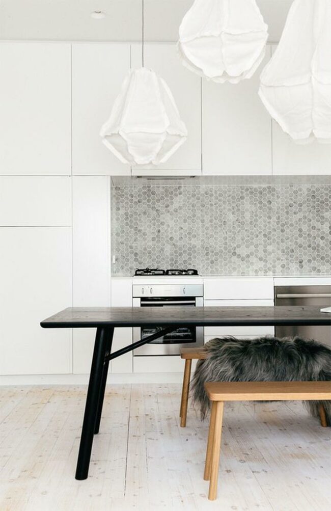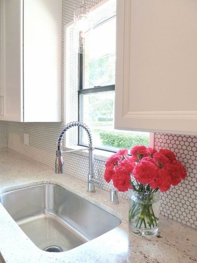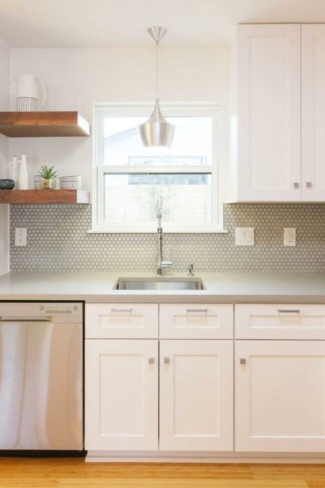 Modern charm radiates from this kitchen where white hexagon tiles create a beautiful backdrop for daily activities.