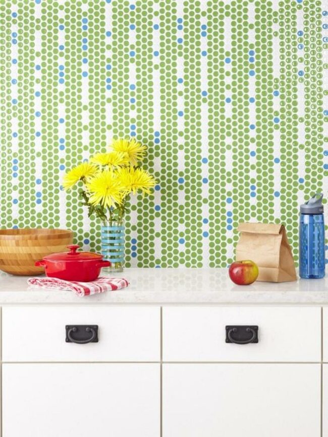 Modern charm radiates from this kitchen counter with its playful green and blue dotted backsplash stealing the spotlight.