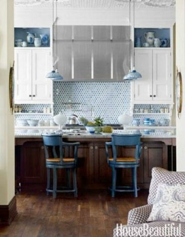 The eye-catching backsplash of small blue tiles adds texture and connects with the chair color for a thoughtful design flow.