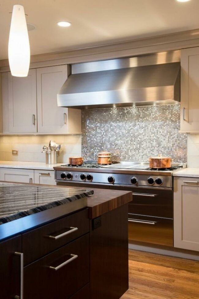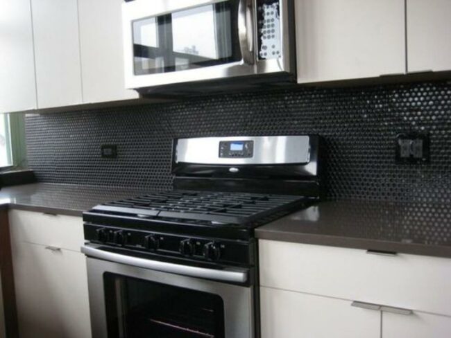 Small round tiles create a textured backsplash that adds character while complementing the stainless steel appliances.