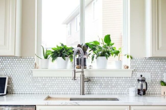 Green plants line the windowsill, adding a refreshing touch of nature against the crisp white surroundings.