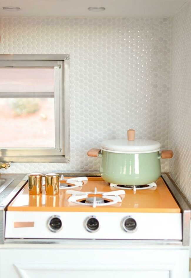 White circular tiles cover the wall, creating a clean backdrop for the eye-catching orange stovetop.