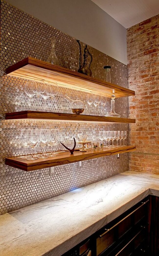 Modern elements stand out in this kitchen where warm wood shelves meet eye-catching patterned tiles along the wall.