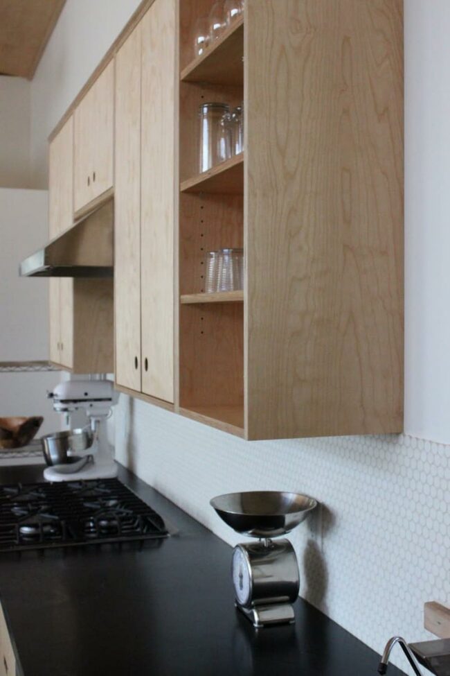 Modern wooden cabinets create a warm, natural vibe in this inviting kitchen space where glass cups are displayed on open shelves for easy access.