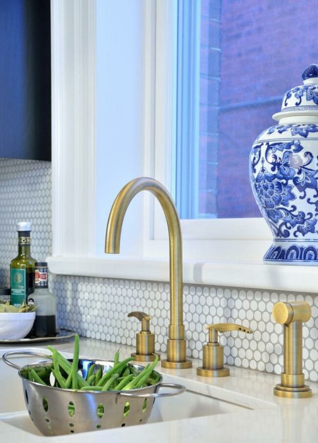 White hexagon tiles create a fresh backdrop for the kitchen sink area where elegant brass fixtures catch the light and elevate the entire space.