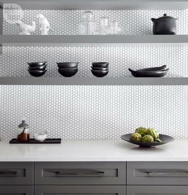 Crisp hexagonal tiles form a striking backsplash that protects the walls while adding subtle texture to the design.