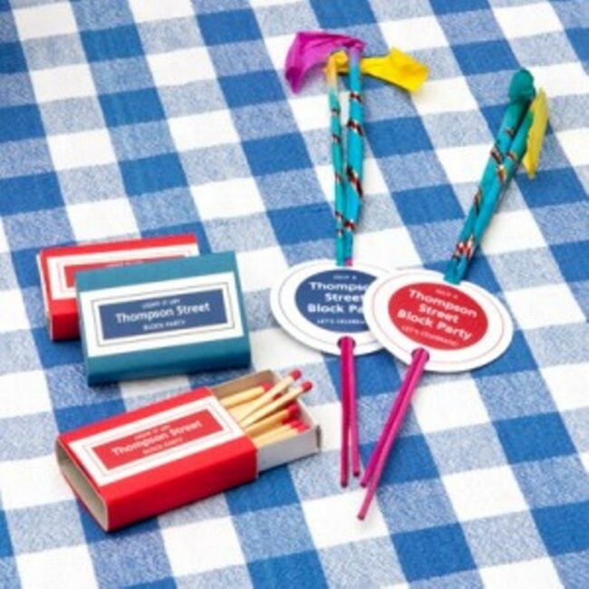 Red and blue matchboxes labeled for the event signal an upcoming outdoor gathering.
