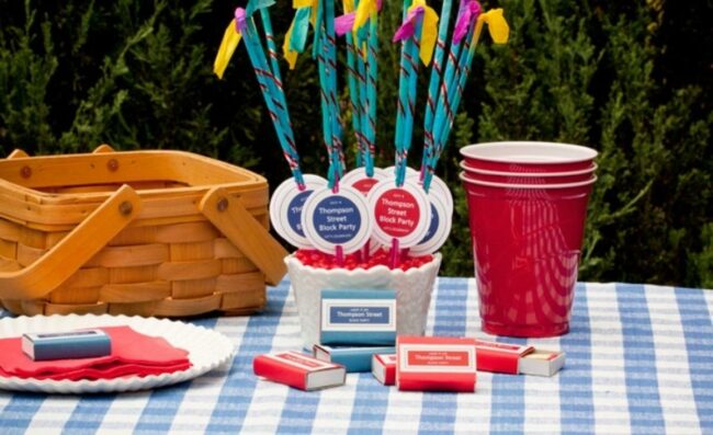 Red, white, and blue details pop against a classic blue and white checkered tablecloth, setting a playful outdoor mood.