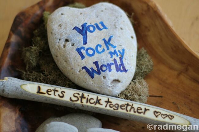 Handcrafted messages etched on stone and wood create tender communication through tactile art.