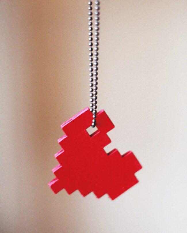 This charming accessory transforms a classic symbol of love into a geeky, retro-inspired piece.