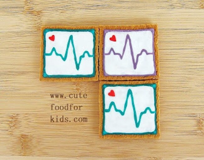 Heartbeat line designs in teal and purple sweep across smooth, shiny surfaces of square treats.