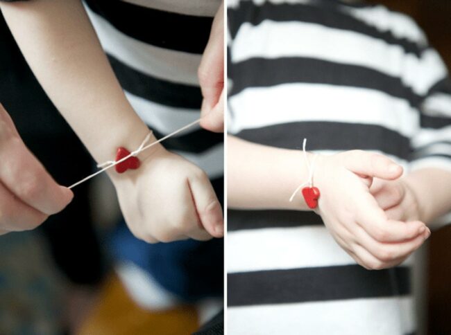 Soft light highlights the gentle interaction between hands tying the bracelet with tender precision.