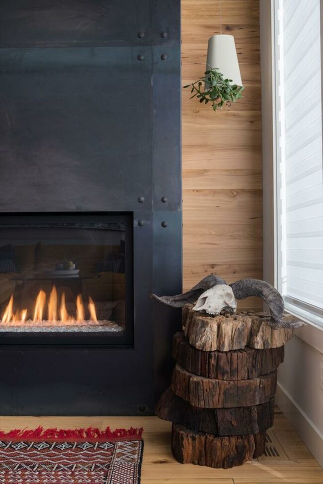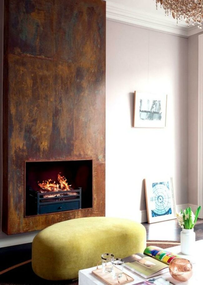 A rust-colored metal fireplace anchors the room with its tall, striking presence and inviting flames.