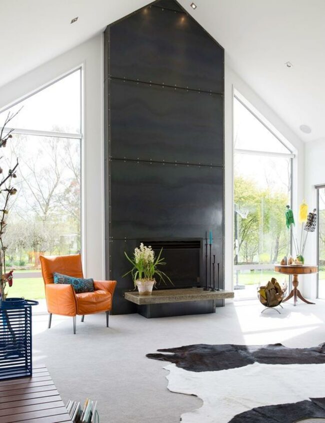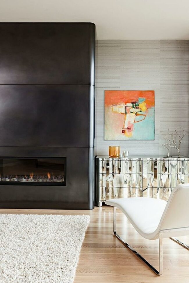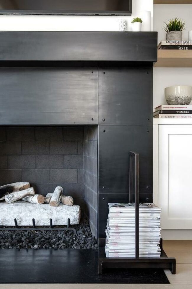 Dark metal fireplaces create dramatic focal points against light walls, instantly drawing you into the space.