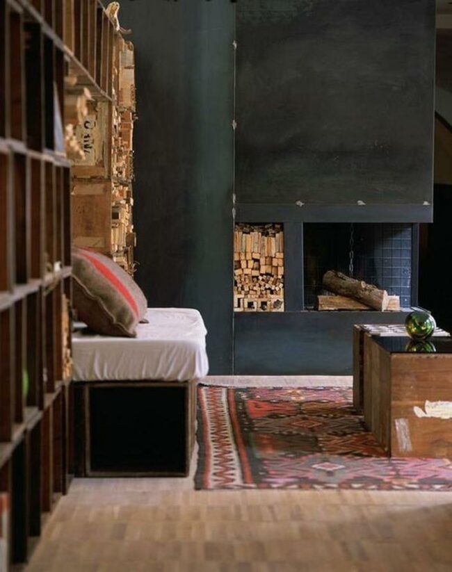 Stacked firewood adds an authentic, organic element to the room's design.