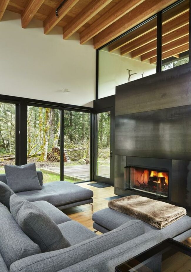 Modern living rooms spark excitement with tall windows that flood the space with natural forest views and light.
