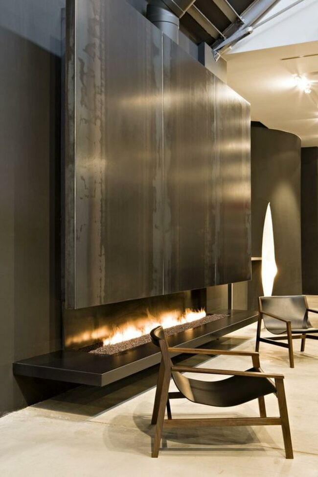 Black-seated wooden chairs frame a long, narrow fireplace that glows warmly against a large metal wall panel.