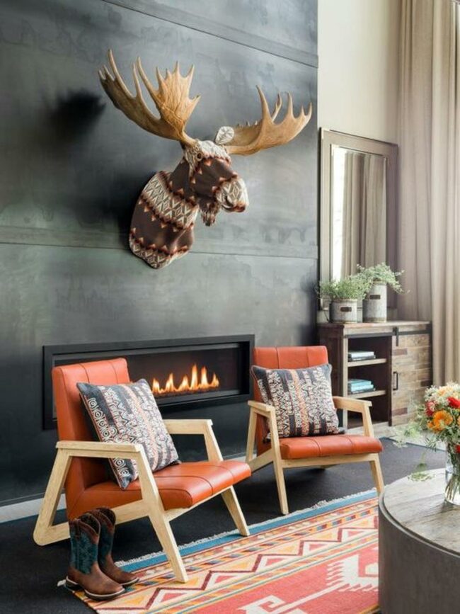A moose head sculpture with a knitted-like texture adds playful character to the wall.