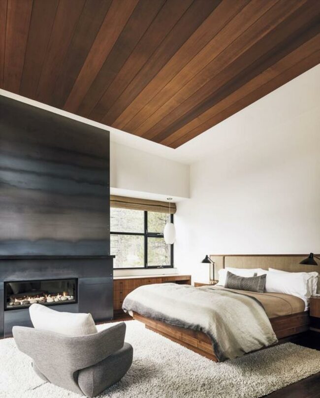 Dark wood ceiling panels add warmth and depth to the contemporary space.