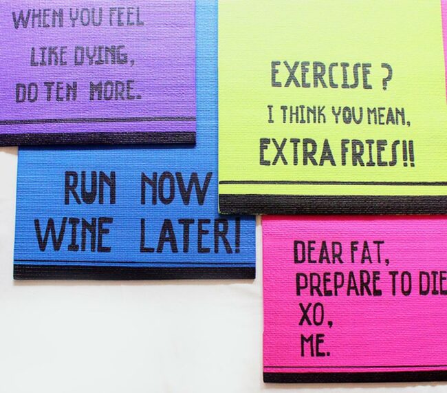 Hot pink canvases declare war on fat with sassy statements that make workout pain feel lighter.