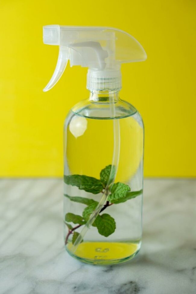 Green mint leaves float gracefully inside a clear spray bottle, creating an instant visual delight.