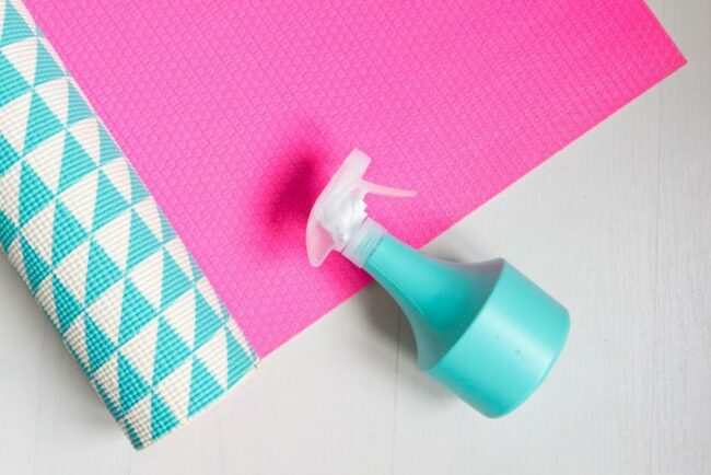 Small blue spray bottles stand ready for mat cleaning and preparation.