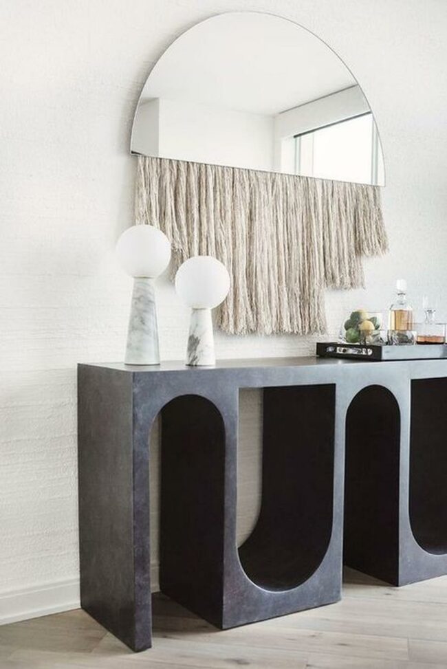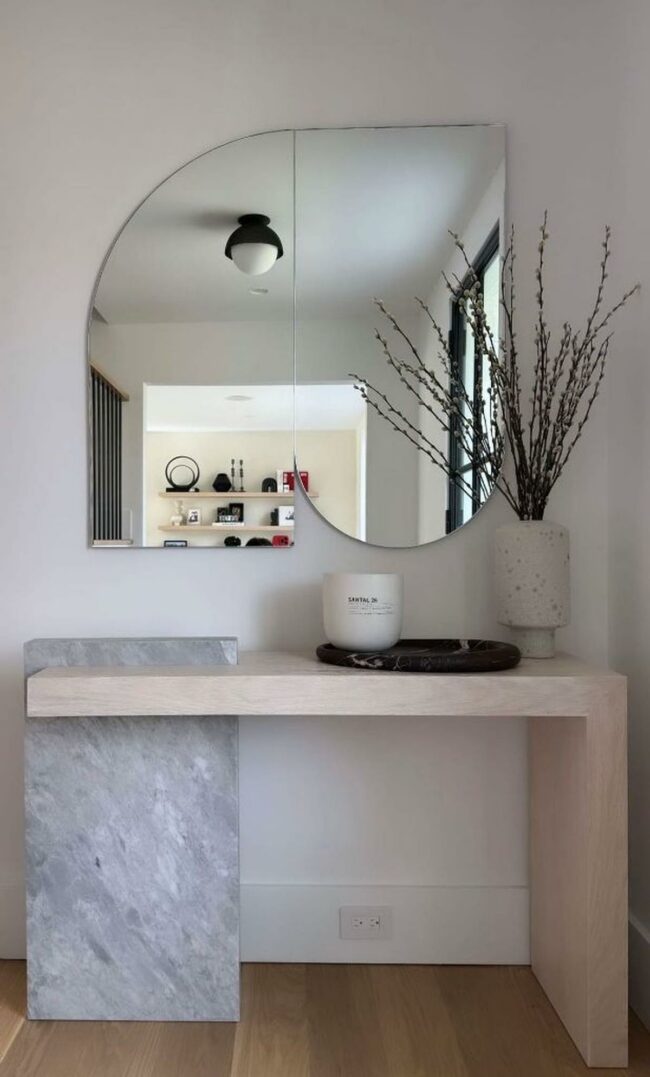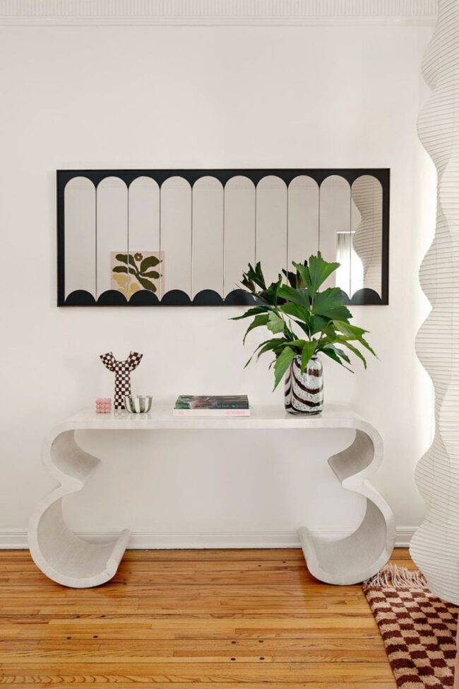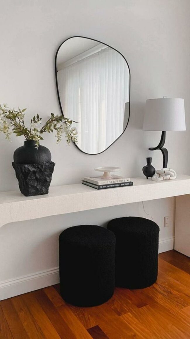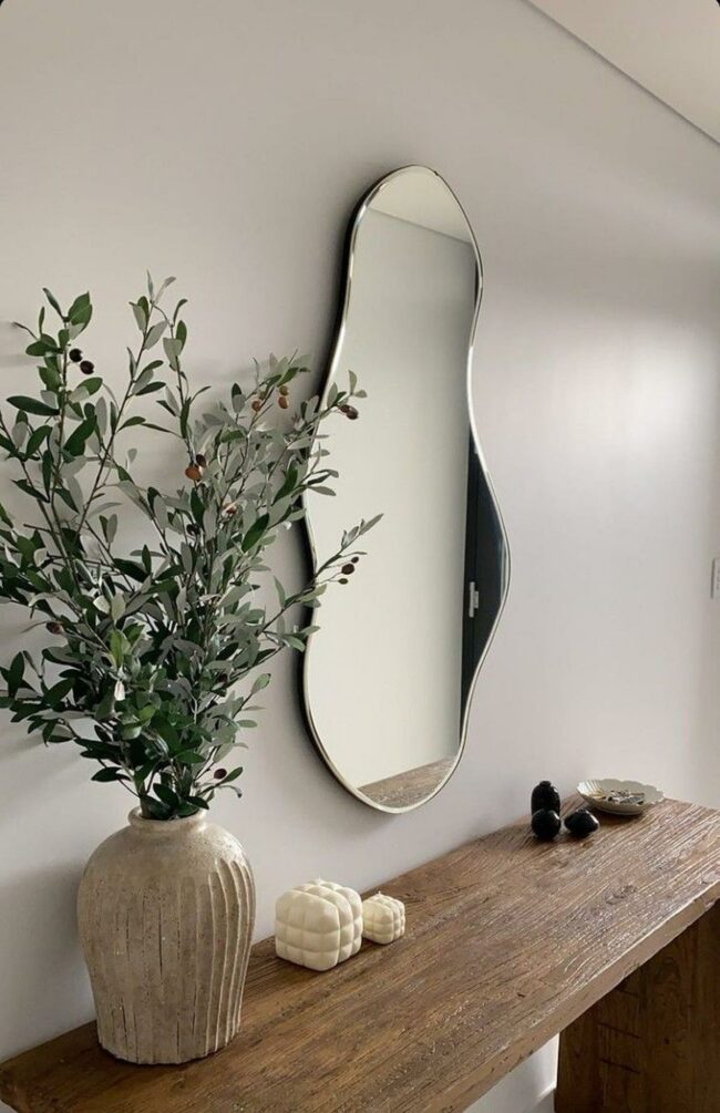 A large, curvy mirror adorns the space above a floating shelf, reflecting light and adding depth.