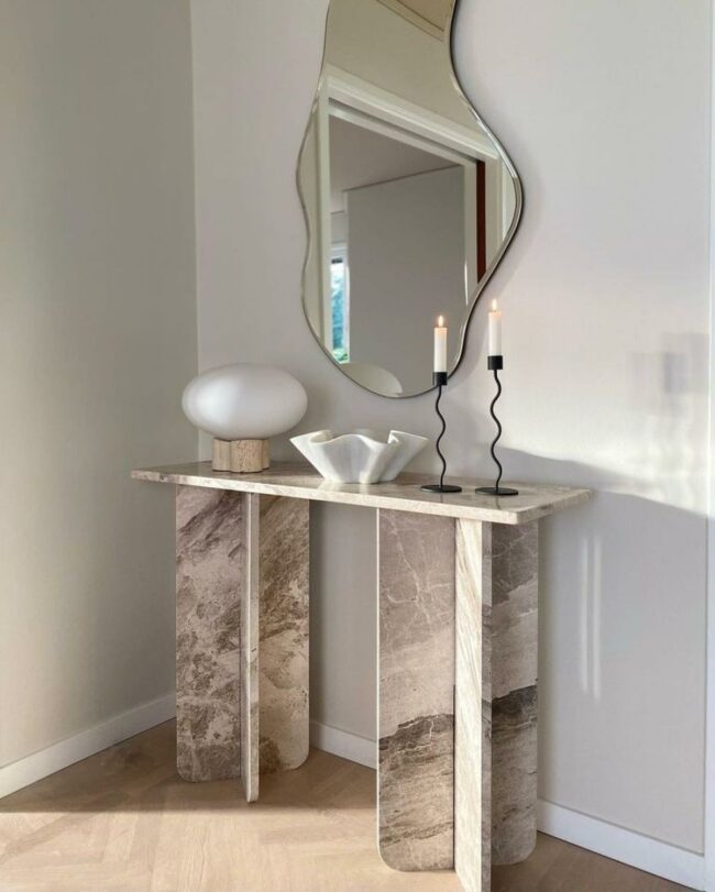 An organically shaped mirror hangs above the table, expanding the visual space and reflecting light.