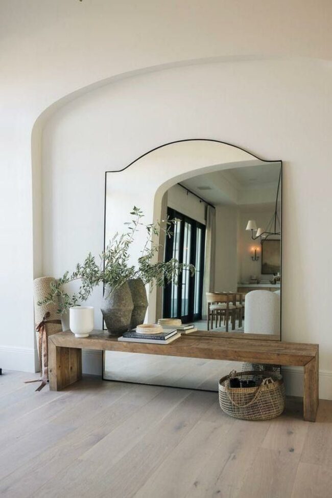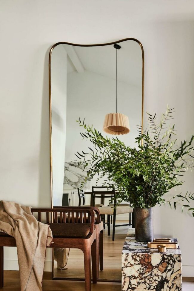 A large arched mirror leans casually in the corner, expanding the visual space and reflecting natural light beautifully.