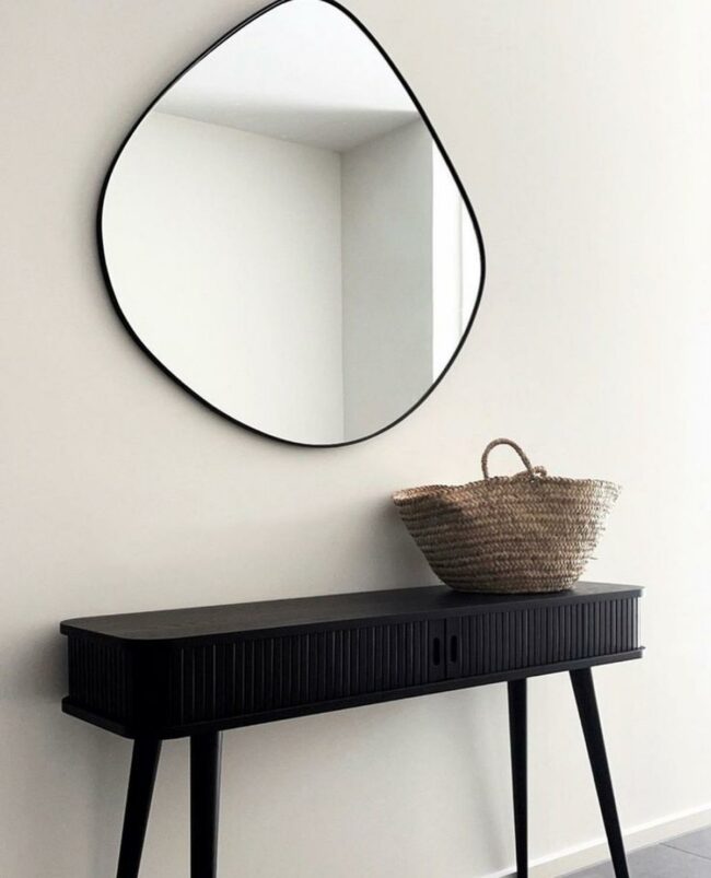 A large black-framed mirror stretches across the wall, instantly expanding the visual space.