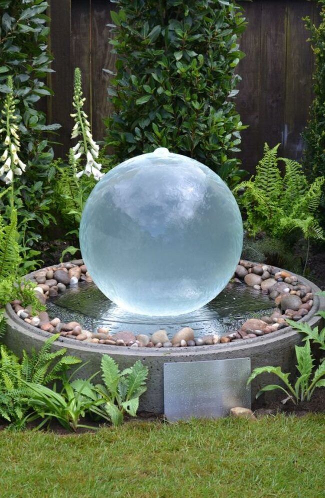 This mesmerizing water fountain creates a tranquil outdoor retreat with its glass sphere resting perfectly in a wide metal basin as water cascades smoothly over its surface.