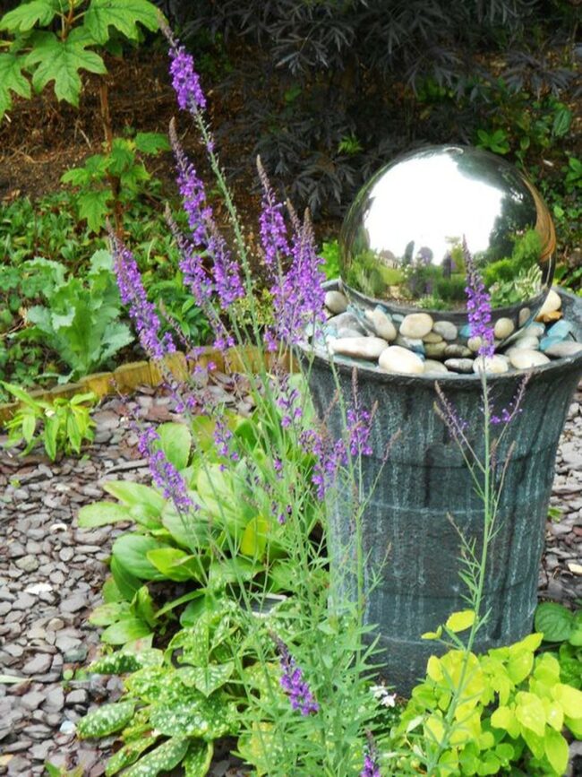 Silver spheres on dark pedestals create eye-catching focal points among purple flowers in this lovely garden display.