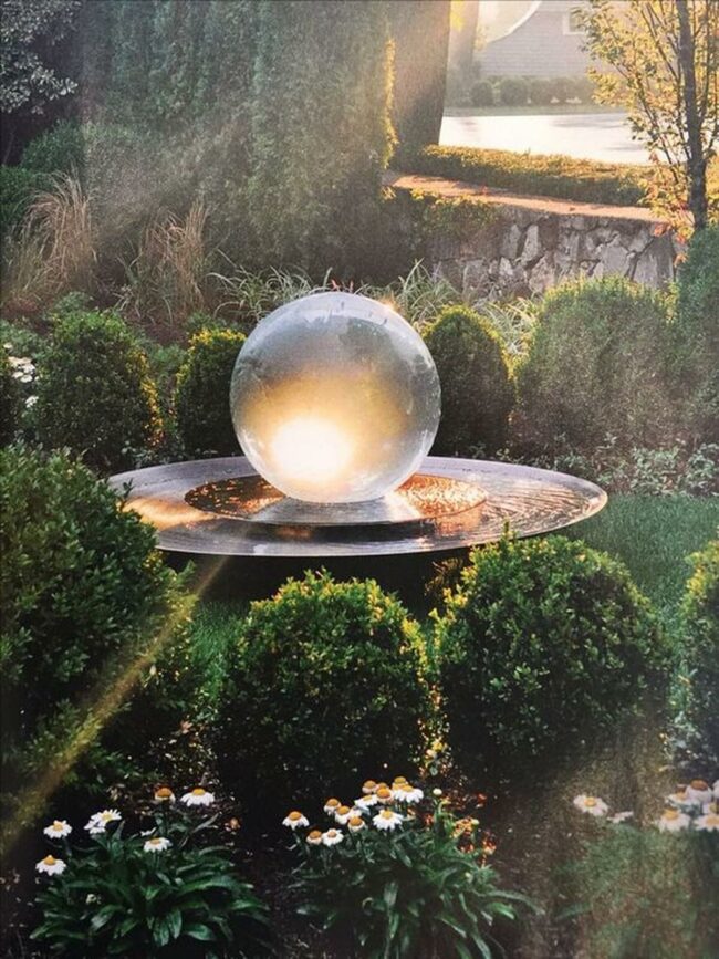 Sunlight dancing through tall trees brings peaceful calm to this enchanting garden where a glass sphere on a round metal base captures light in almost magical ways.