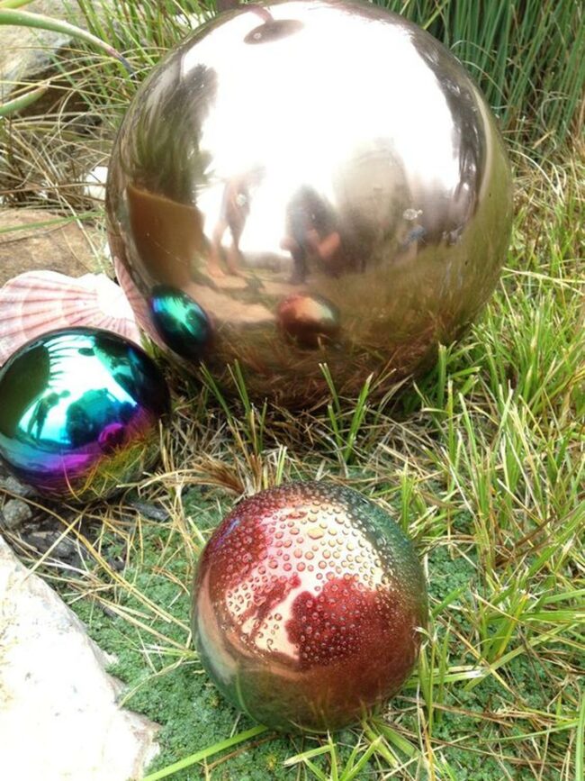 These shimmering orbs create beautiful focal points while reflecting the surrounding garden in their mirrored surfaces.