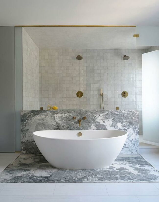 Modern elegance meets comfort in this serene bathroom where light tiles and smooth stone create an airy atmosphere.
