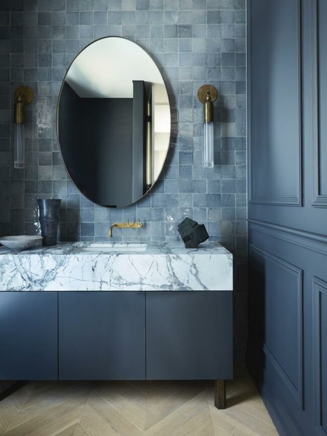 Deep blue walls and tiles create a modern bathroom atmosphere that feels both refreshing and sophisticated.