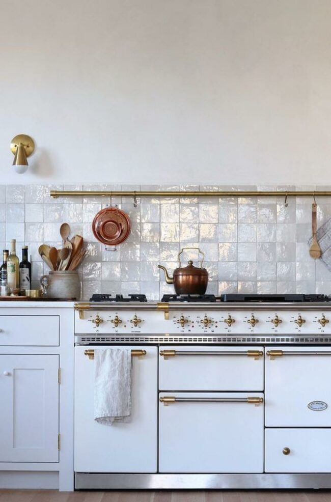 Golden-hued tiles splash the kitchen walls with joyful energy, while crisp white cabinets featuring delicate gold pulls create an airy atmosphere.