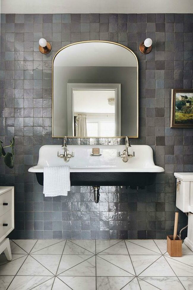 Modern elegance meets timeless charm in this bathroom with dark gray wall tiles and light marble flooring.