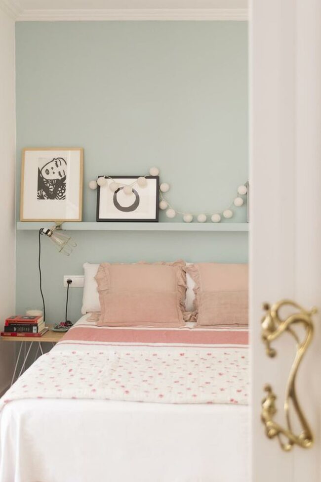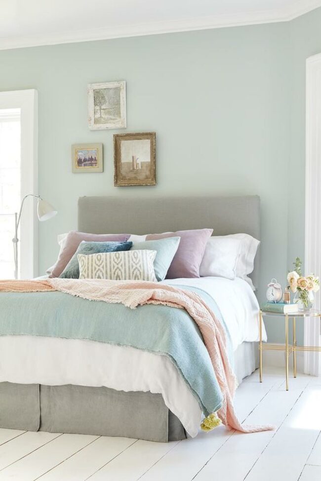 Light blue walls paired with white floorboards create a calm bedroom atmosphere that anyone would love to call their own.