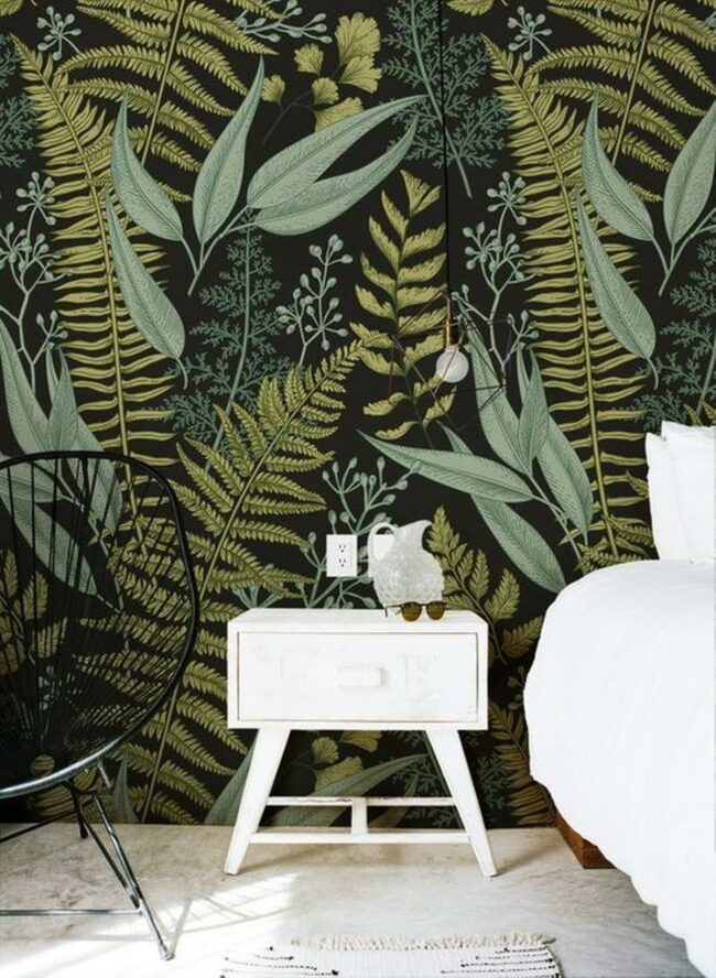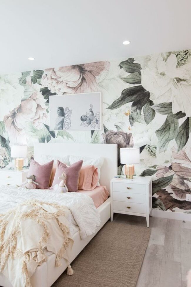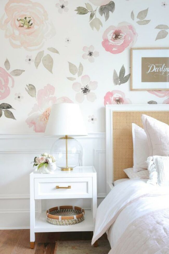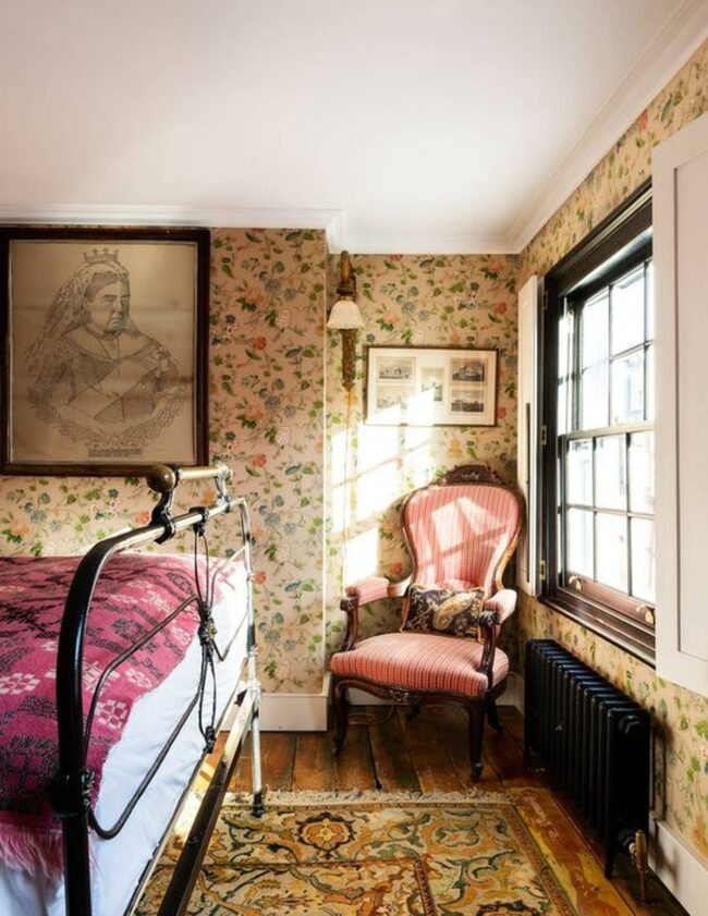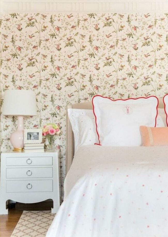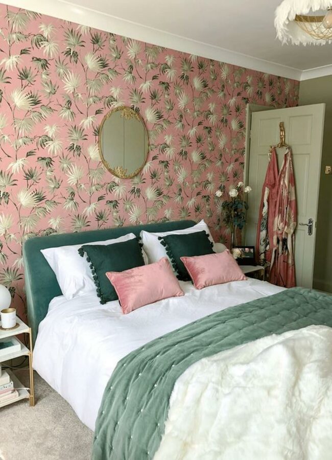 Pink floral wallpaper with green leaves creates a cheerful mood in this delightful bedroom.