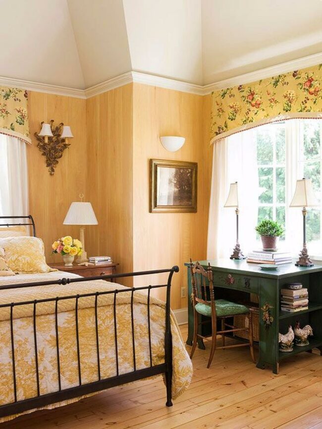 Sunlight pours into this charming bedroom from a generous window where little plants and a cheerful yellow lamp rest on the wide sill.